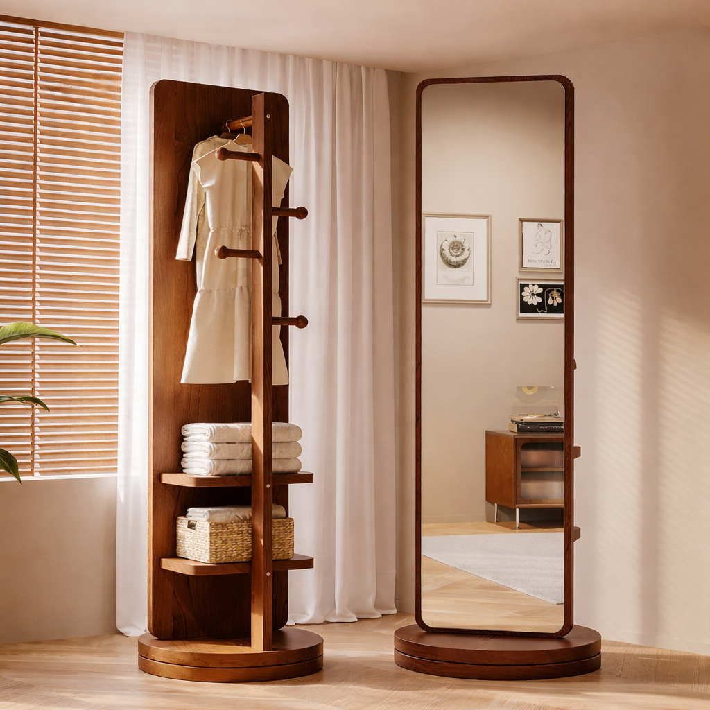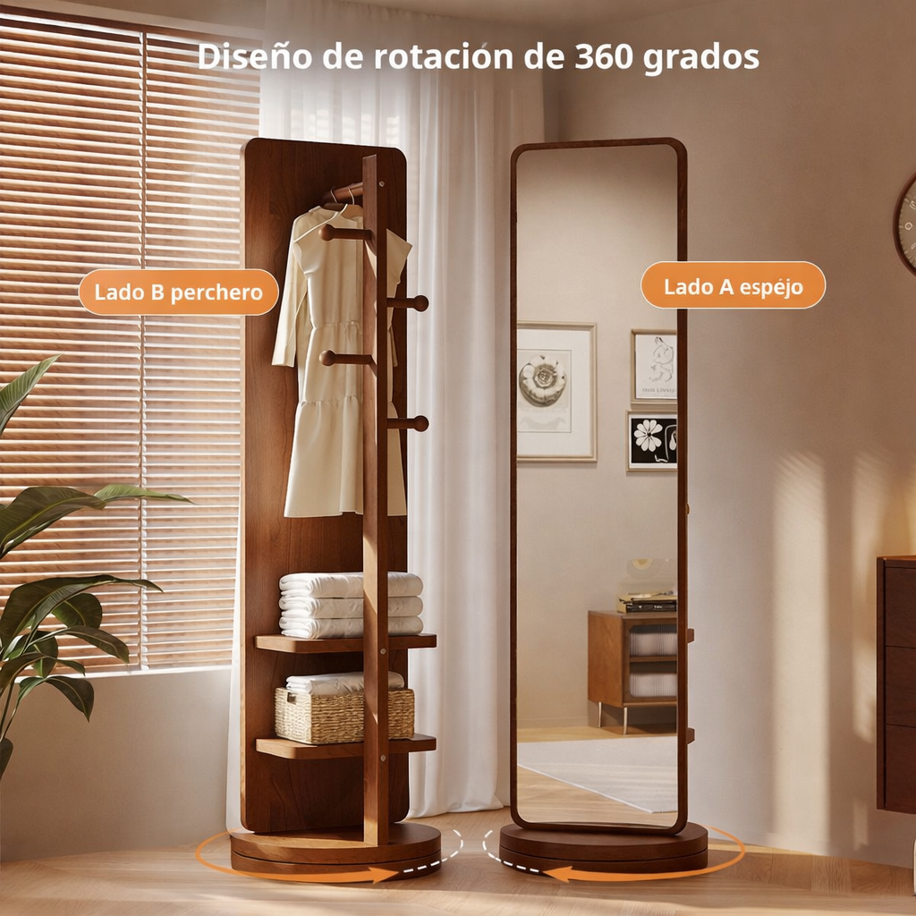 Espejo perchero de cuerpo entero que combina funcionalidad y diseño en una sola pieza. Con dimensiones de 168 cm de alto x 45 cm de ancho, permite verse completamente mientras ofrece espacio para colgar prendas y accesorios. Perfecto para dormitorios, vestidores, recibidores y salas de estar, maximiza el uso del espacio sin sacrificar estilo. Su marco moderno se adapta a cualquier decoración contemporánea. Ideal para quienes buscan optimizar espacios pequeños con soluciones prácticas y elegantes. Requiere armado.